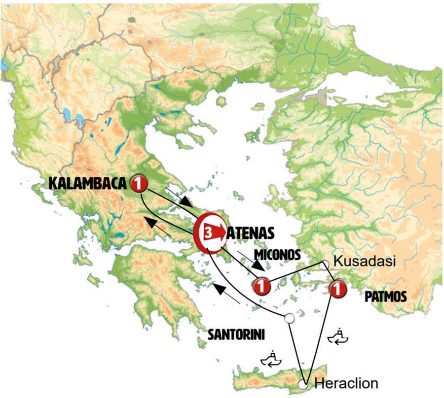 ATENAS, MICONOS, KUSADASI, PATMOS, HERACLION, SANTORINI, KAMENA VOURLA, KALAMBAKA, DELFOS