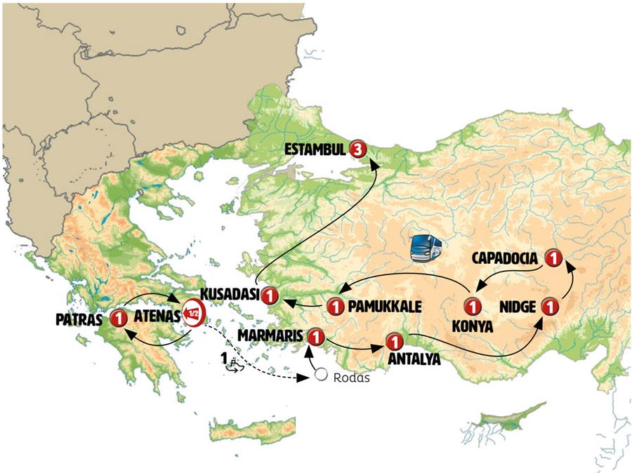 ATENAS, TRIPOLI, OLIMPIA, PATRAS, NAFPAKTOS, MICENAS, ACROCORINTO, FERRI ATENAS RODAS, RODAS, MARMARIS, DALYAN, ANTALYA, ASPENDO, SIDE, KARAMAN, NIGDE, CAPADOCIA, IHLARA, KONYA, EGRIDIR, PAMUKKALE, EFESO, KUSADASI, ESMIRNA, BURSA, ESTAMBUL