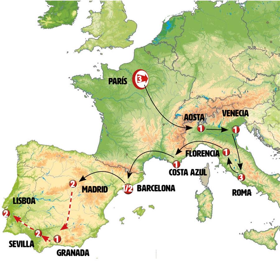 PARIS, GINEBRA, AOSTA, VENECIA, RAVENA, ASIS, ROMA, FLORENCIA, PISA, SESTRI LEVANTE, MONTECARLO, COSTA AZUL, ARLES, BARCELONA, MADRID