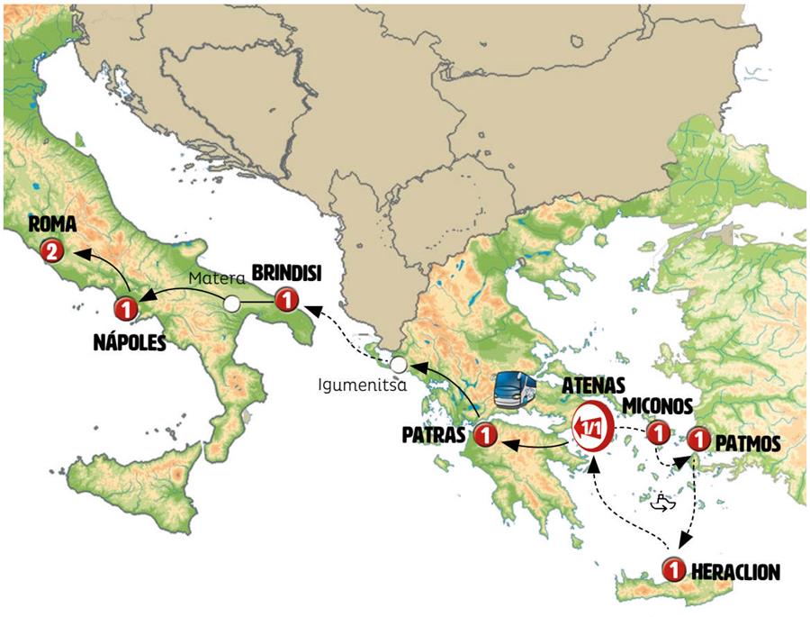 ATENAS, MICONOS, KUSADASI, PATMOS, RODAS, HERACLION, SANTORINI, TRIPOLI, OLIMPIA, PATRAS, IGUMENITSA, FERRI IGUMENITSA BRINDISI, BRINDISI, ALBEROBELLO, MATERA, NAPOLES, CAPRI, POMPEYA, ROMA