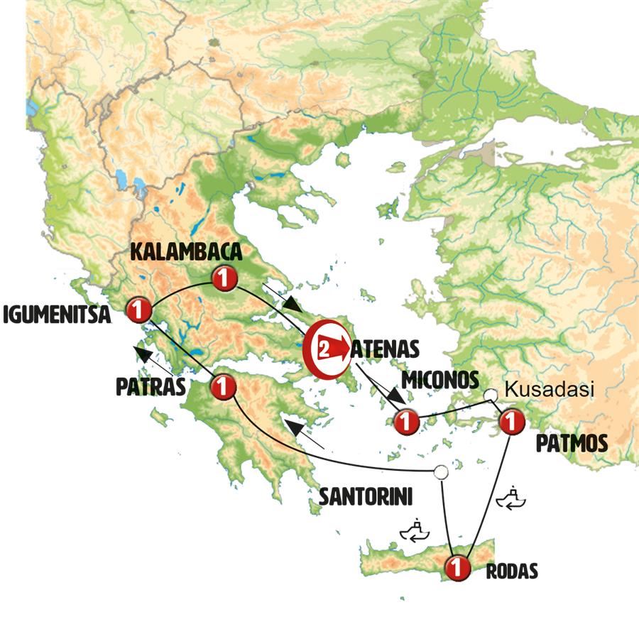 ATENAS, MICONOS, KUSADASI, PATMOS, RODAS, HERACLION, SANTORINI, TRIPOLI, OLIMPIA, PATRAS, IGUMENITSA, CORFU, METSOVO, KALAMBAKA, DELFOS, OSIOS LOUKAS