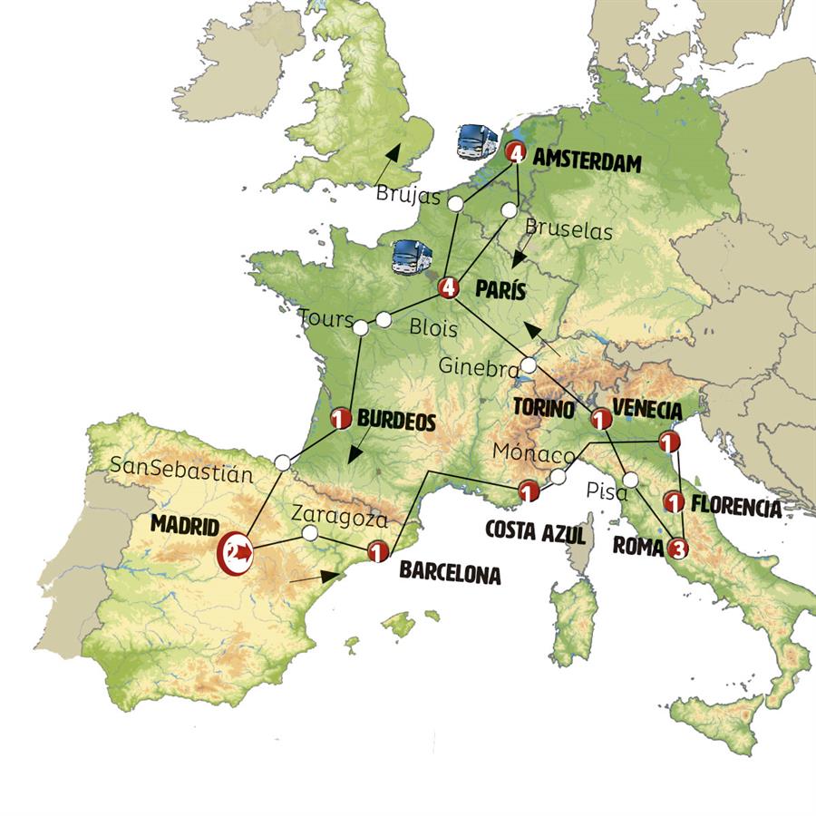 MADRID, ZARAGOZA, BARCELONA, COSTA AZUL, MONACO, GENOVA, VENECIA, FLORENCIA, ROMA, PISA, TURIN, GINEBRA, PARIS, BRUJAS, AMSTERDAM, KINDERDIJK, BRUSELAS, BLOIS, TOURS, BURDEOS, SAN SEBASTIAN, AREA DE SERVICIO FORONDA