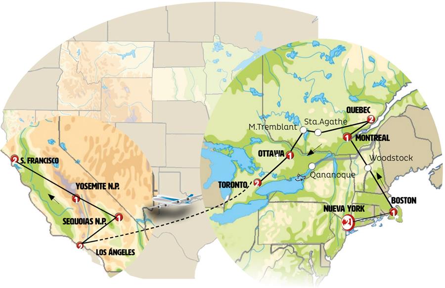 NUEVA YORK, BOSTON, WOODSTOCK, MONTREAL, QUEBEC, ST AGATA DES MONTS, MT TREMBLANT, OTAWA, MIL ISLAS, TORONTO, LOS ANGELES, SANTA MONICA, SOLVANG, BAKERSFIELD, GRAN SEQUOYA NP, FRESNO, YOSEMITE, SAN FRANCISCO
