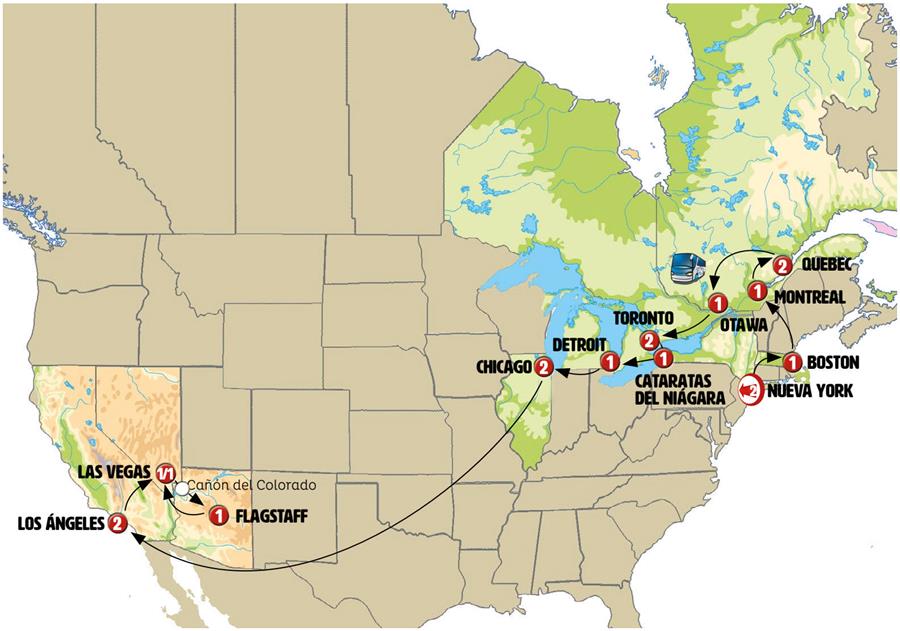 NUEVA YORK, BOSTON, WOODSTOCK, MONTREAL, QUEBEC, ST AGATA DES MONTS, MT TREMBLANT, OTAWA, MIL ISLAS, TORONTO, NIAGARA ON THE LAKE, CATARATAS DEL NIAGARA, DETROIT, SAUGATUCK, CHICAGO, LOS ANGELES, LAS VEGAS, CAÑON DEL COLORADO, FLAGSTAFF
