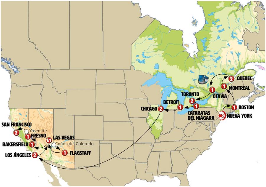 NUEVA YORK, BOSTON, WOODSTOCK, MONTREAL, QUEBEC, ST AGATA DES MONTS, MT TREMBLANT, OTAWA, MIL ISLAS, TORONTO, NIAGARA ON THE LAKE, CATARATAS DEL NIAGARA, DETROIT, SAUGATUCK, CHICAGO, LOS ANGELES, LAS VEGAS, CAÑON DEL COLORADO, FLAGSTAFF, DEATH VALLEY, BAKERSFIELD, GRAN SEQUOYA NP, FRESNO, YOSEMITE, SAN FRANCISCO