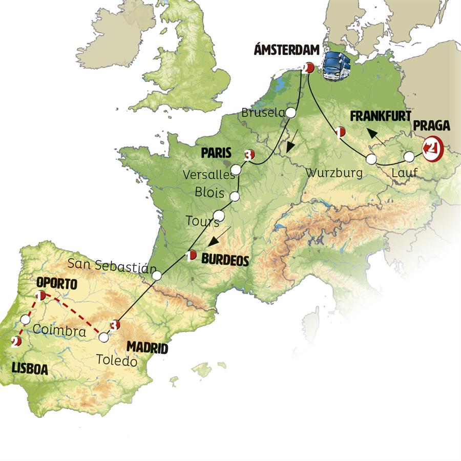 PRAGA, PILSEN, ROTEMBURGO, FRANKFURT, CRUCERO POR EL RHIN, COLONIA, AMSTERDAM, BRUSELAS, PARIS, BLOIS, TOURS, BURDEOS, SAN SEBASTIAN, AREA DE SERVICIO FORONDA, MADRID, CIUDAD RODRIGO, OPORTO, COIMBRA, BATALHA, NAZARE, OBIDOS, LISBOA