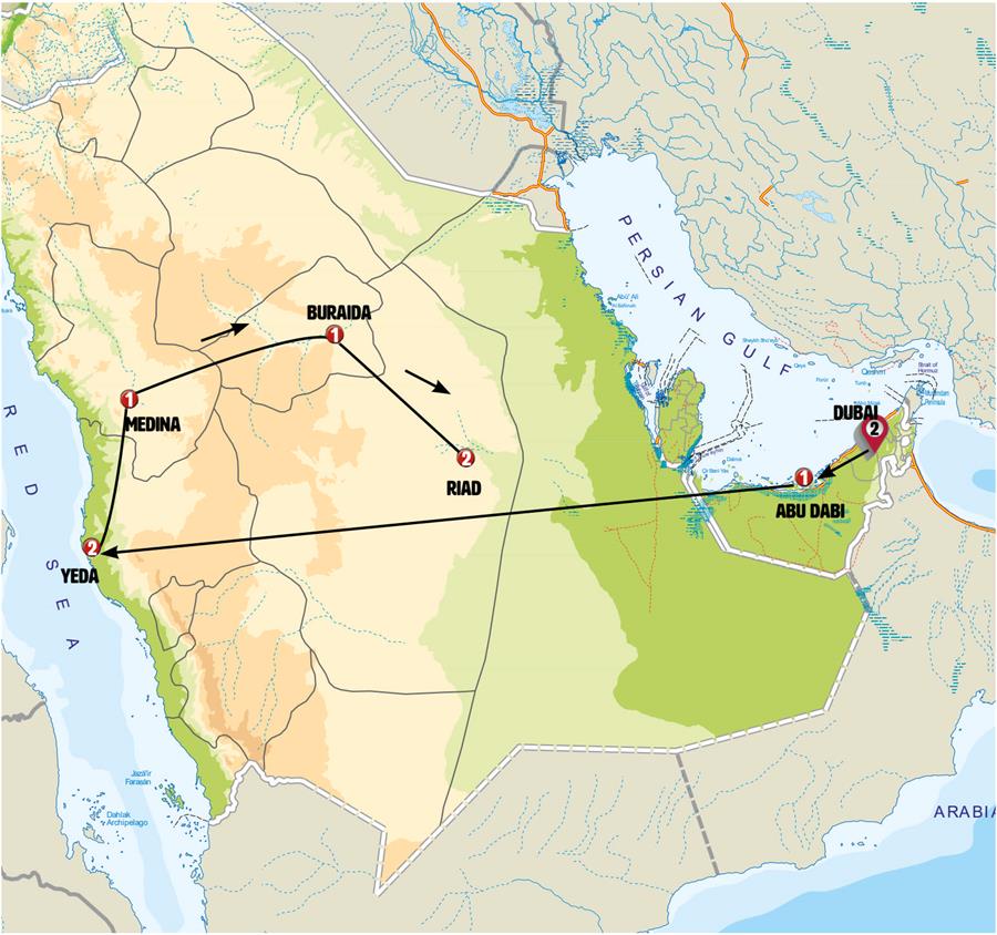 DUBAI, ABU DABI, YEDA, MEDINA, BURAIDA, RIAD