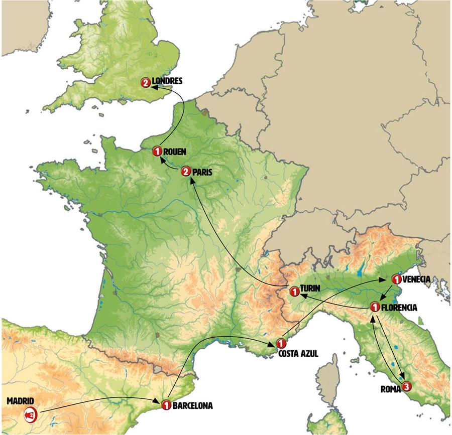 MADRID, ZARAGOZA, BARCELONA, COSTA AZUL, MONACO, GENOVA, VENECIA, FLORENCIA, ROMA, PISA, TURIN, GINEBRA, PARIS, ROUEN, CANAL DE LA MANCHA, CANTERBURY, LONDRES