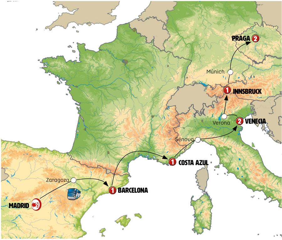 MADRID, ZARAGOZA, BARCELONA, COSTA AZUL, MONACO, GENOVA, VENECIA, VERONA, LAGO DE GARDA, INNSBRUCK, MUNICH, RATISBONA, PRAGA