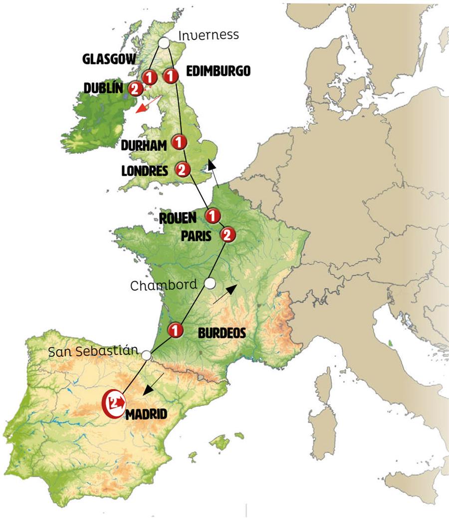 MADRID, SAN SEBASTIAN, BURDEOS, CHAMBORD, PARIS, ROUEN, CANAL DE LA MANCHA, CANTERBURY, LONDRES, CAMBRIDGE, YORK, DURHAM, ALNWICK, EDIMBURGO, INVERNESS, LAGO NESS, FORT AUGUSTUS, GLASGOW, BELFAST, DUBLIN