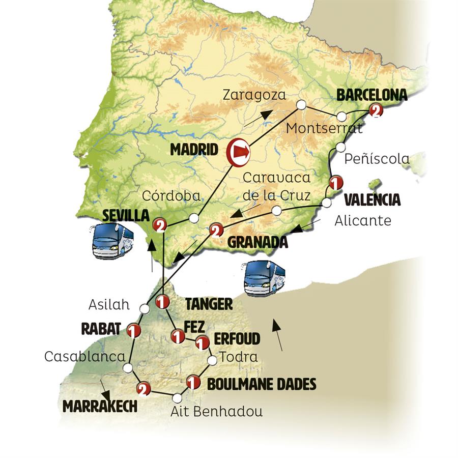 MADRID, ZARAGOZA, POBLET, BARCELONA, PENISCOLA, VALENCIA, ALICANTE, CARAVACA DE LA CRUZ, GRANADA, TANGER, ASSILAH, RABAT, CASABLANCA, MARRAKECH, AIT BEN HADU, OUARZAZATE, BOUMALNE DADES, TODRA, ERFOUD, FEZ, SEVILLA, CORDOBA, CONSUEGRA