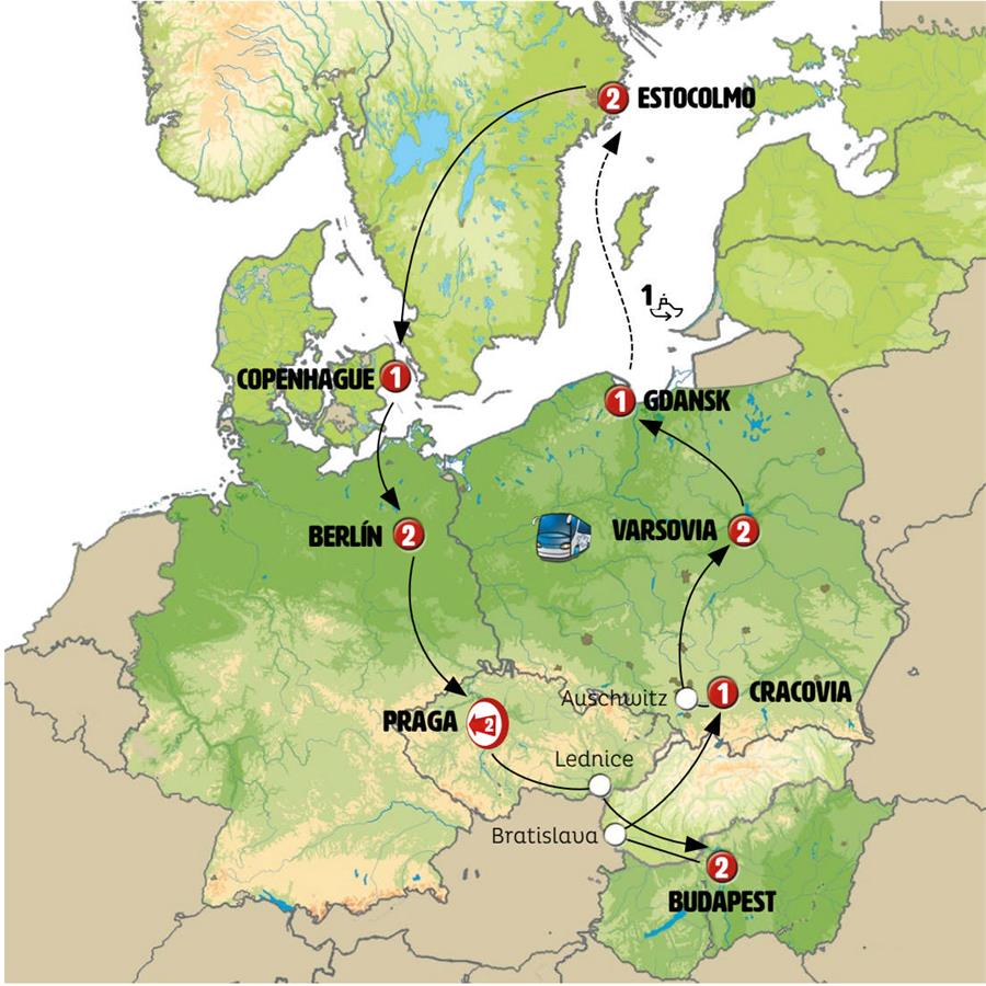 PRAGA, LEDNICE, BUDAPEST, BRATISLAVA, TRENCIN, CRACOVIA, AUSCHWITZ, CZESTOCHOWA, VARSOVIA, OLSZTYNEK, CANAL ELBLAG, MALBORK, GDANSK, SOPOT, FERRY SOPOT KARLSKRONA, VASTERVIK, ESTOCOLMO, HELSINGOR, COPENHAGUE, BERLIN, DRESDE