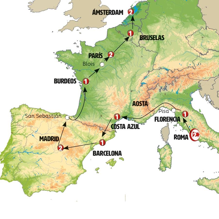 ROMA, FLORENCIA, PISA, SESTRI LEVANTE, MONTECARLO, COSTA AZUL, ARLES, BARCELONA, MADRID, SAN SEBASTIAN, BURDEOS, BLOIS, PARIS, EPERLECQUES, CALAIS, BRUJAS, GANTE, LA HAYA, AMSTERDAM