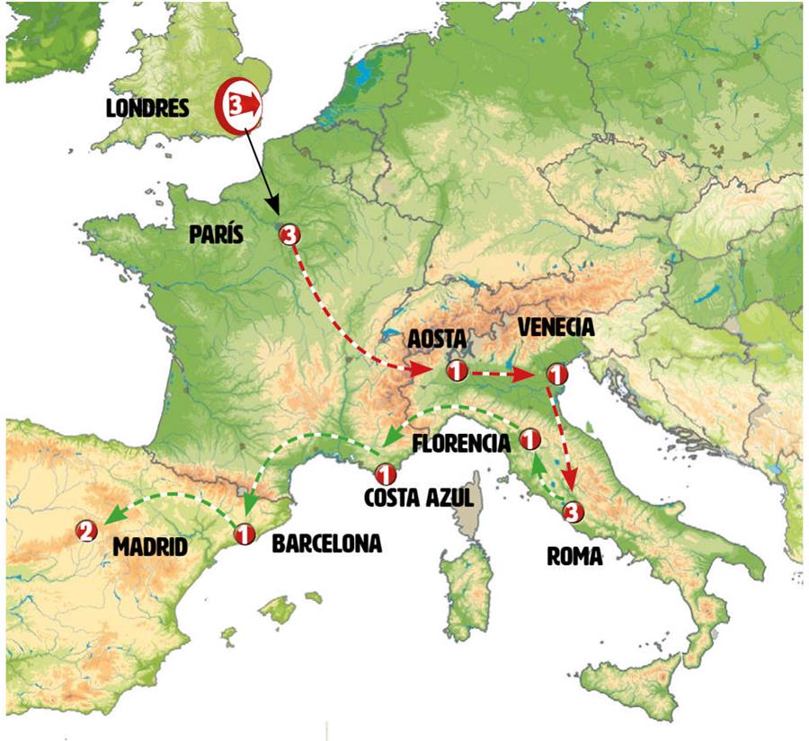 LONDRES, CALAIS, AMIENS, PARIS, GINEBRA, AOSTA, VENECIA, RAVENA, ASIS, ROMA, FLORENCIA, PISA, SESTRI LEVANTE, MONTECARLO, COSTA AZUL, ARLES, BARCELONA, MADRID