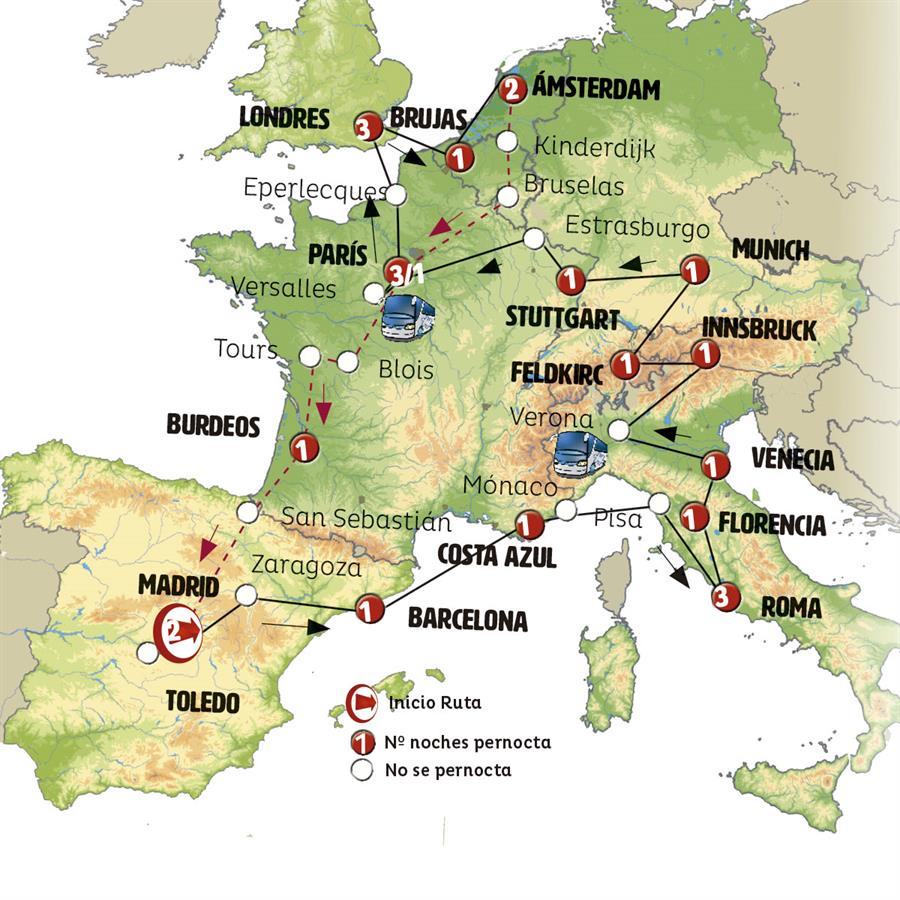 MADRID, ZARAGOZA, BARCELONA, COSTA AZUL, MONACO, GENOVA, PISA, FLORENCIA, ROMA, BOLONIA, FERRARA, VENECIA, VERONA, LAGO DE GARDA, INNSBRUCK, ZUGSPITZE, FELDKIRCH, LAGO CONSTANZA, LINDAU, MUNICH, STUTTGART, HEIDELBERG, ESTRASBURGO, PARIS, CANTERBURY, LONDRES, CANAL DE LA MANCHA, BRUJAS, GANTE, MIDDELBURG, ROTTERDAM, AMSTERDAM