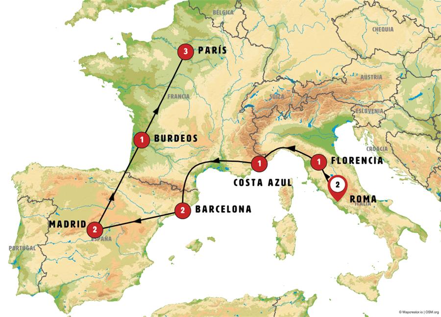 ROMA, FLORENCIA, PISA, SESTRI LEVANTE, MONTECARLO, COSTA AZUL, ARLES, BARCELONA, MADRID, SAN SEBASTIAN, BURDEOS, BLOIS, PARIS
