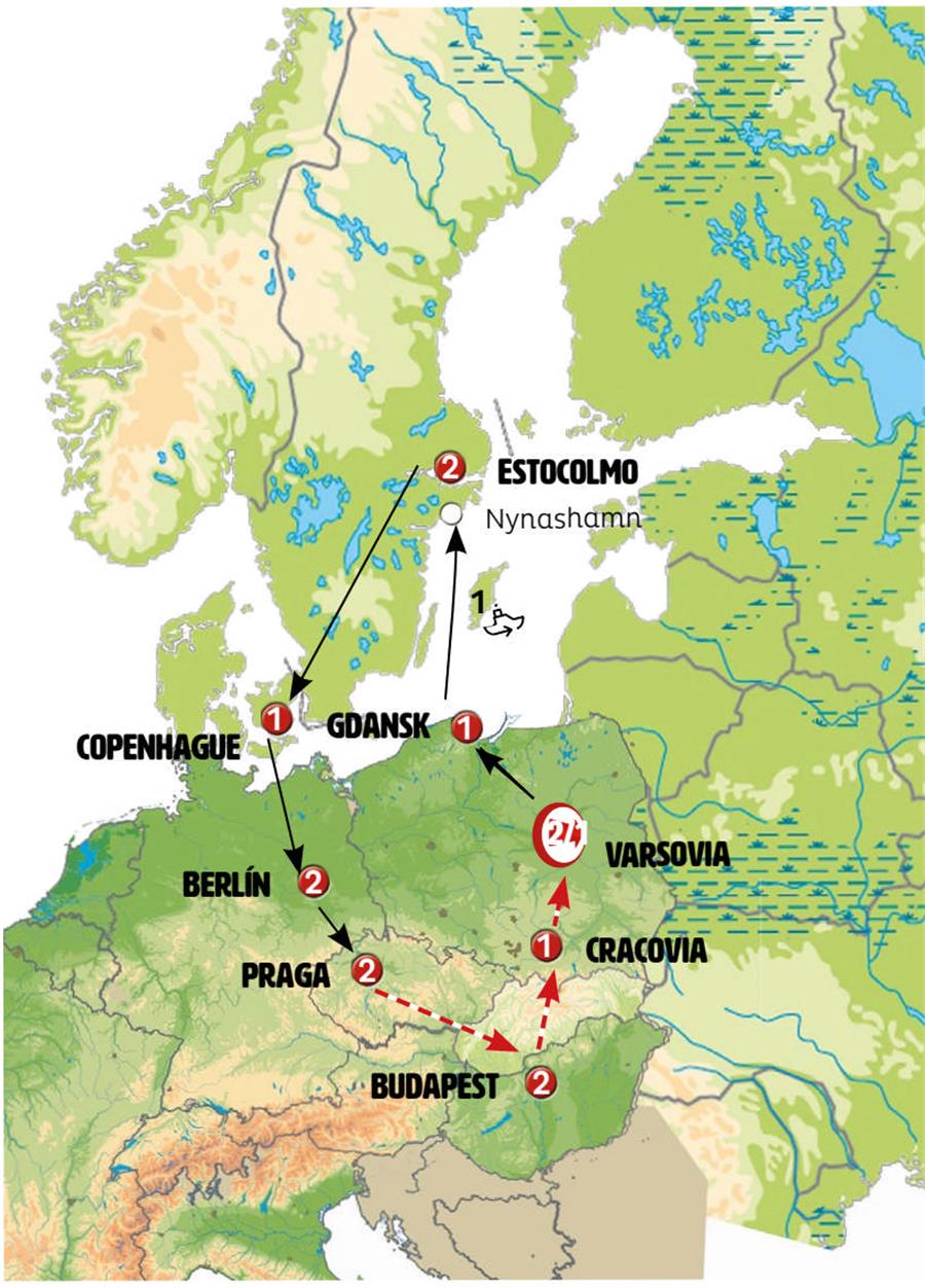VARSOVIA, OLSZTYNEK, CANAL ELBLAG, MALBORK, GDANSK, SOPOT, FERRY SOPOT KARLSKRONA, VASTERVIK, ESTOCOLMO, HELSINGOR, COPENHAGUE, BERLIN, DRESDE, PRAGA, LEDNICE, BUDAPEST, BRATISLAVA, TRENCIN, CRACOVIA, AUSCHWITZ, CZESTOCHOWA