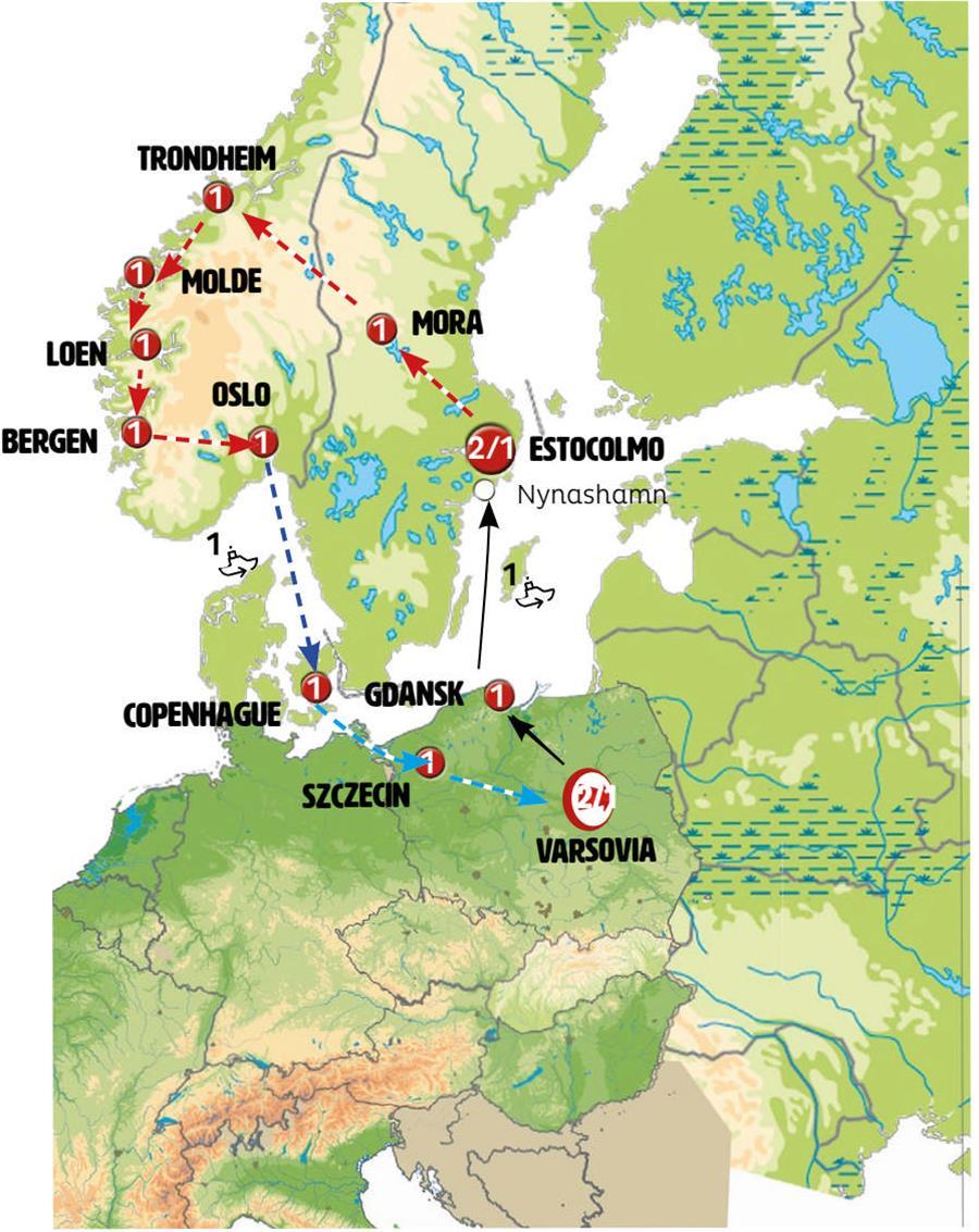 VARSOVIA, OLSZTYNEK, CANAL ELBLAG, MALBORK, GDANSK, SOPOT, FERRY SOPOT KARLSKRONA, VASTERVIK, ESTOCOLMO, MORA, FUNASDALEN, ROROS, TRONDHEIM, KRISTIANSUND, CARRETERA ATLANTICA, MOLDE, GEIRANGER, BRIKSDAL, LOEN, BERGEN, EIDFJORD, VORINGFOSSEN, GEILO, OSLO, FERRI OSLO COPENHAGUE, COPENHAGUE, ROSTOCK, SZCZECIN, BYDGOSZCZ, TORUN