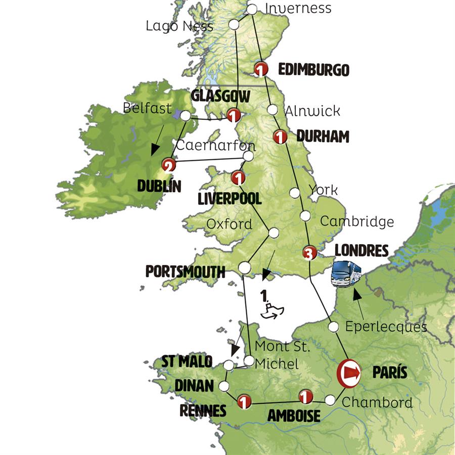 PARIS, CANTERBURY, LONDRES, CAMBRIDGE, YORK, DURHAM, ALNWICK, EDIMBURGO, INVERNESS, LAGO NESS, FORT AUGUSTUS, GLASGOW, BELFAST, DUBLIN, CAERNARFON, LIVERPOOL, STRATFORD, OXFORD, BARCO PORTHSMOUTH SAINT MALO, MONT SAINT MICHEL, SAINT MALO, DINAN, RENNES, ANGERS, TOURS, VILLANDRY, AMBOISE, CHENONCEAUX, CHAMBORD