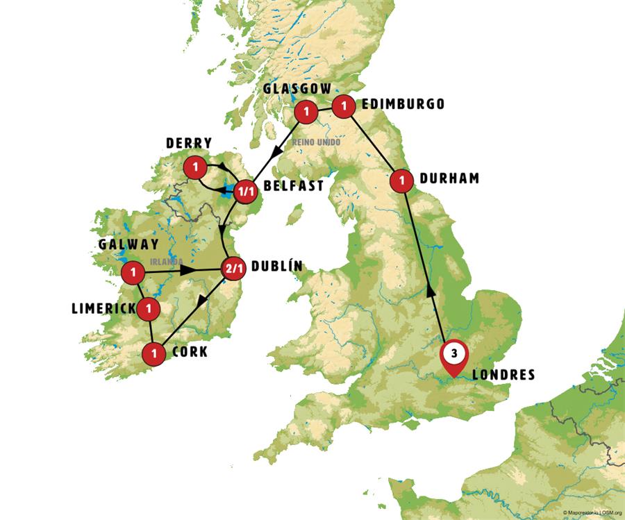 LONDRES, CAMBRIDGE, YORK, DURHAM, ALNWICK, EDIMBURGO, INVERNESS, LAGO NESS, FORT AUGUSTUS, GLASGOW, BELFAST, CUSHENDUN, BALLYCASTLE, CALZADA DEL GIGANTE, DERRY, DONEGAL, MARBLE ARCH, CASTILLO DE HILLSBOROUGH, DUBLIN, POWERSCOURT, KILKENNY, CASHEL, CORK, KINSALE, KILLARNEY, LIMERICK, ACANTILADOS DE MOHER, GALWAY, CLONMACNOISE