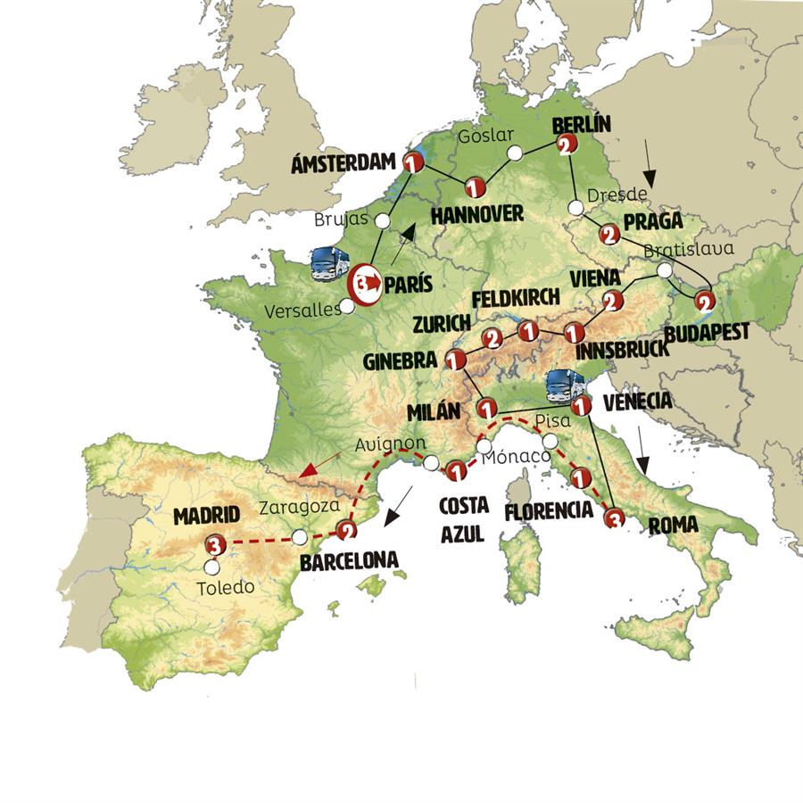 PARIS, BRUJAS, AMSTERDAM, HANNOVER, GOSLAR, BERLIN, DRESDE, PRAGA, LEDNICE, GYOR, BUDAPEST, BRATISLAVA, VIENA, SALZBURGO, INNSBRUCK, ZUGSPITZE, FELDKIRCH, SAINT GALLEN, CONSTANZA, STEIN AM RHEIN, CATARATAS DEL RIN, ZURICH, BERNA, CASTILLO DE CHILLON, GINEBRA, MILAN, VENECIA, RAVENA, ASIS, ROMA, FLORENCIA, PISA, SESTRI LEVANTE, MONTECARLO, COSTA AZUL, ARLES, BARCELONA, COMARCA DEL PENEDES, ZARAGOZA, MADRID