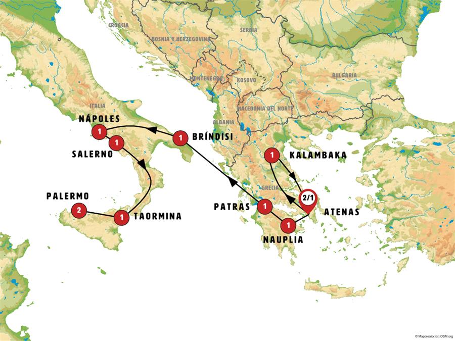 ATENAS, KAMENA VOURLA, KALAMBAKA, DELFOS, CORINTO, POROS, EPIDAURO, NAUPLIA, TRIPOLI, OLIMPIA, PATRAS, IGUMENITSA, FERRI IGUMENITSA BRINDISI, BRINDISI, ALBEROBELLO, MATERA, NAPOLES, CAPRI, SORRENTO, SALERNO, PAOLA, MESINA, TAORMINA, GIARDINI NAXOS, VILLA ROMANA DEL CASALE, PALERMO