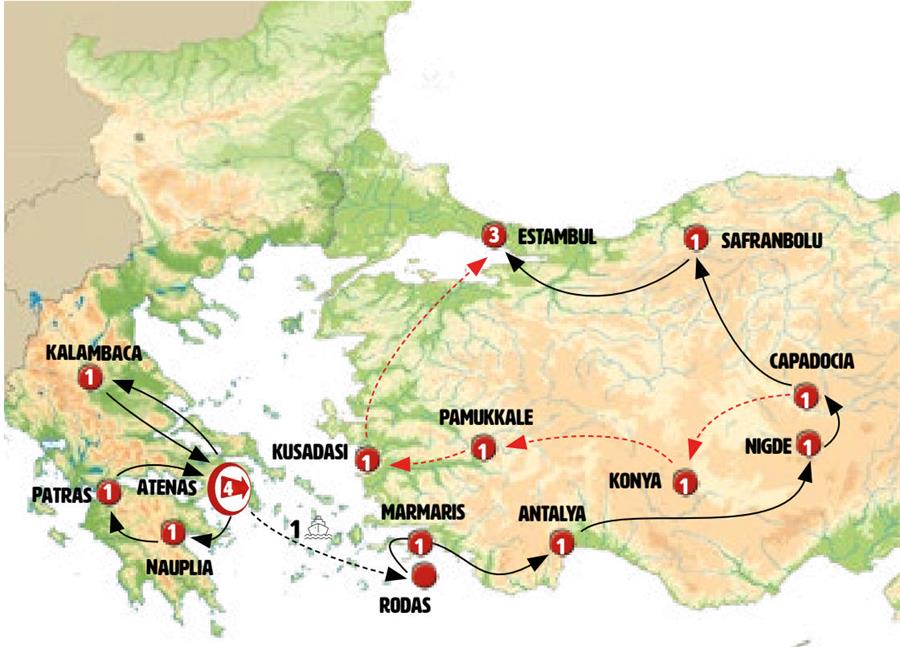 ATENAS, KAMENA VOURLA, KALAMBAKA, DELFOS, CORINTO, POROS, EPIDAURO, NAUPLIA, TRIPOLI, OLIMPIA, PATRAS, NAFPAKTOS, MICENAS, ACROCORINTO, FERRI ATENAS RODAS, RODAS, MARMARIS, DALYAN, ANTALYA, ASPENDO, SIDE, KARAMAN, NIGDE, CAPADOCIA, IHLARA, KONYA, EGRIDIR, PAMUKKALE, EFESO, KUSADASI, ESMIRNA, BURSA, ESTAMBUL