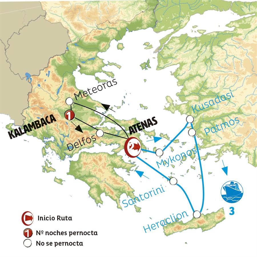 ATENAS, KAMENA VOURLA, KALAMBAKA, DELFOS, MICONOS, KUSADASI, PATMOS, HERACLION, SANTORINI