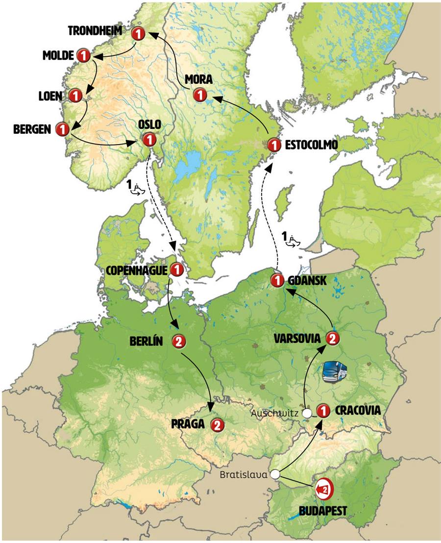 BUDAPEST, BRATISLAVA, TRENCIN, CRACOVIA, AUSCHWITZ, CZESTOCHOWA, VARSOVIA, OLSZTYNEK, CANAL ELBLAG, MALBORK, GDANSK, SOPOT, FERRY SOPOT KARLSKRONA, VASTERVIK, ESTOCOLMO, MORA, FUNASDALEN, ROROS, TRONDHEIM, KRISTIANSUND, CARRETERA ATLANTICA, MOLDE, GEIRANGER, BRIKSDAL, LOEN, BERGEN, EIDFJORD, VORINGFOSSEN, GEILO, OSLO, FERRI OSLO COPENHAGUE, COPENHAGUE
