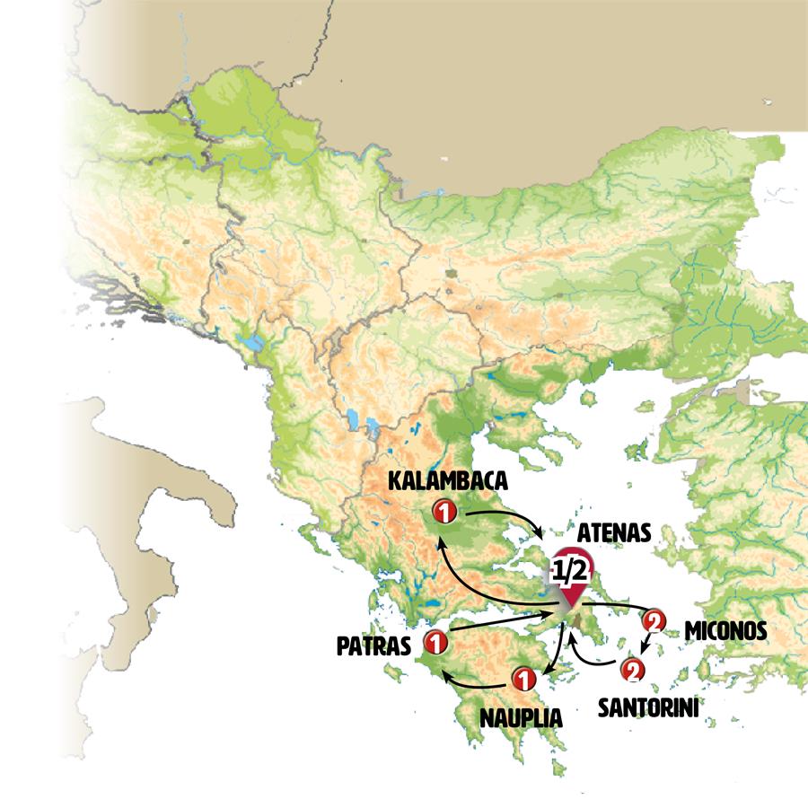 ATENAS, MICONOS, SANTORINI, KAMENA VOURLA, KALAMBAKA, DELFOS, CORINTO, POROS, EPIDAURO, NAUPLIA, TRIPOLI, OLIMPIA, PATRAS, NAFPAKTOS, MICENAS, ACROCORINTO