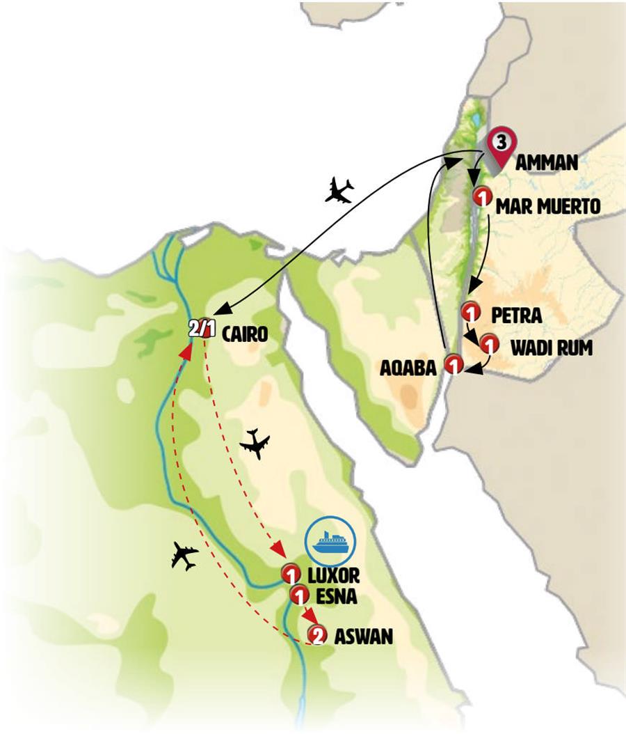AMMAN, JERASH, MADABA, BETANIA, MAR MUERTO, SHOBAK, PETRA, WADI RUM, AQABA, EL CAIRO