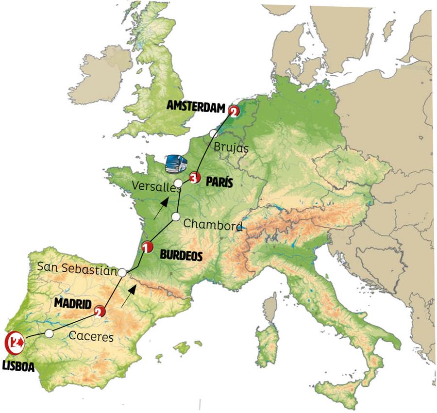 LISBOA, CACERES, MADRID, SAN SEBASTIAN, BURDEOS, CHAMBORD, PARIS, BRUJAS, AMSTERDAM
