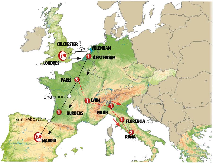 LONDRES, COLCHESTER, FERRI COLCHESTER VOLENDAM, VOLENDAM, AMSTERDAM, BRUJAS, PARIS, BLOIS, TOURS, BURDEOS, SAN SEBASTIAN, AREA DE SERVICIO FORONDA, MADRID