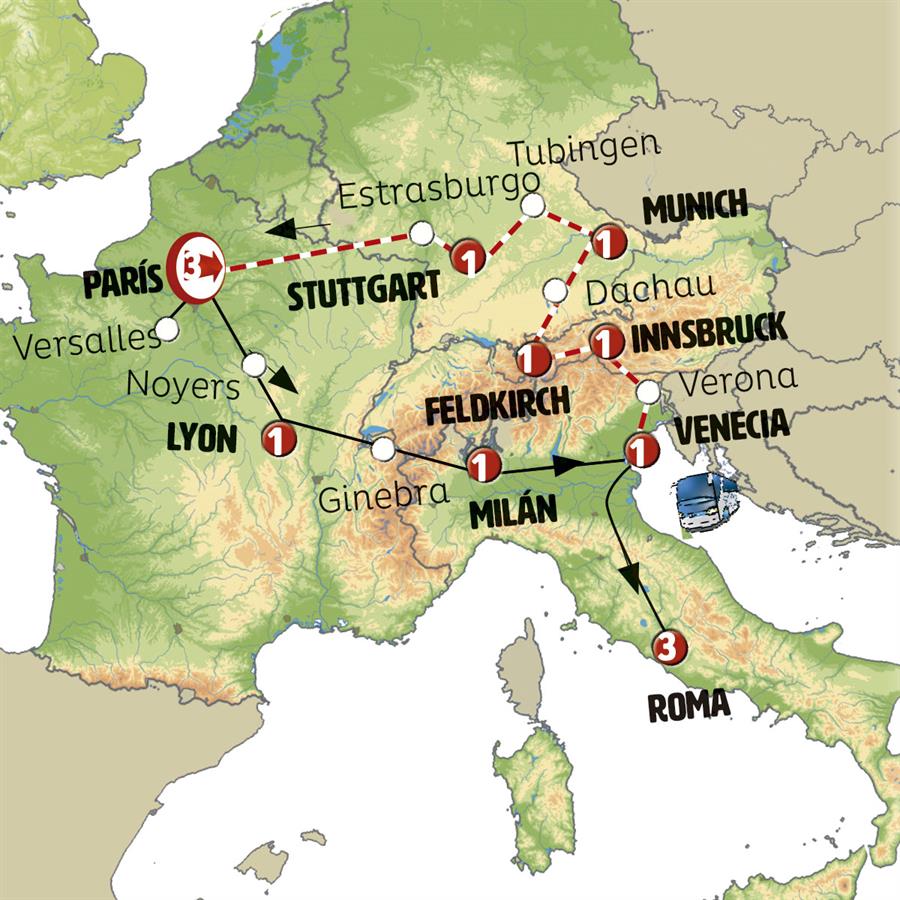 MADRID, ZARAGOZA, BARCELONA, COSTA AZUL, MONACO, GENOVA, PISA, FLORENCIA, ROMA, BOLONIA, FERRARA, VENECIA, VERONA, LAGO DE GARDA, INNSBRUCK, ZUGSPITZE, FELDKIRCH, LAGO CONSTANZA, LINDAU, MUNICH, STUTTGART, HEIDELBERG, ESTRASBURGO, PARIS, BLOIS, TOURS, BURDEOS, SAN SEBASTIAN, AREA DE SERVICIO FORONDA