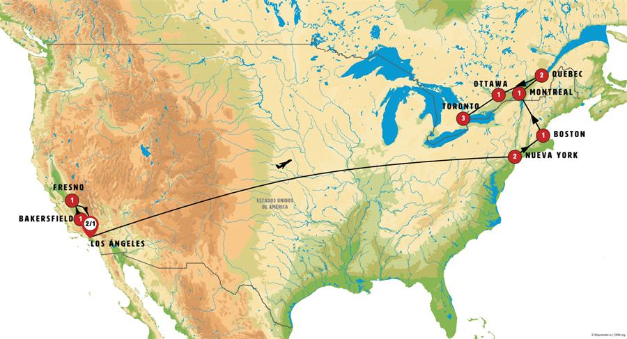 LOS ANGELES, SANTA MONICA, SOLVANG, BAKERSFIELD, YOSEMITE, FRESNO, GRAN SEQUOYA NP, NUEVA YORK, BOSTON, WOODSTOCK, MONTREAL, QUEBEC, ST AGATA DES MONTS, MT TREMBLANT, OTAWA, MIL ISLAS, TORONTO