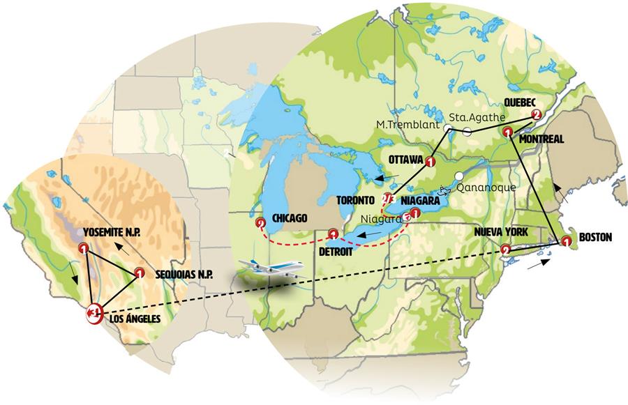 LOS ANGELES, SANTA MONICA, SOLVANG, BAKERSFIELD, YOSEMITE, FRESNO, GRAN SEQUOYA NP, NUEVA YORK, BOSTON, WOODSTOCK, MONTREAL, QUEBEC, ST AGATA DES MONTS, MT TREMBLANT, OTAWA, MIL ISLAS, TORONTO, NIAGARA ON THE LAKE, CATARATAS DEL NIAGARA, DETROIT, SAUGATUCK, CHICAGO