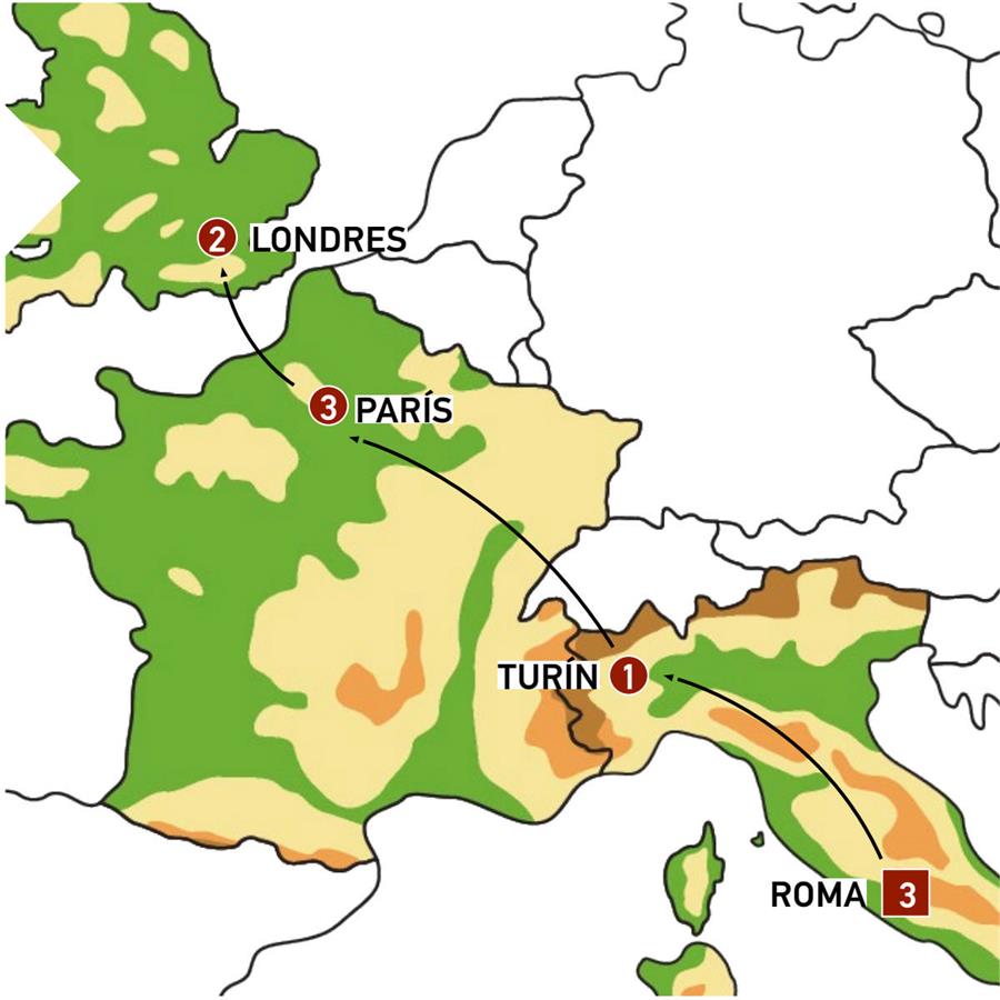 ROMA, PISA, TURIN, GINEBRA, PARIS, CANTERBURY, LONDRES
