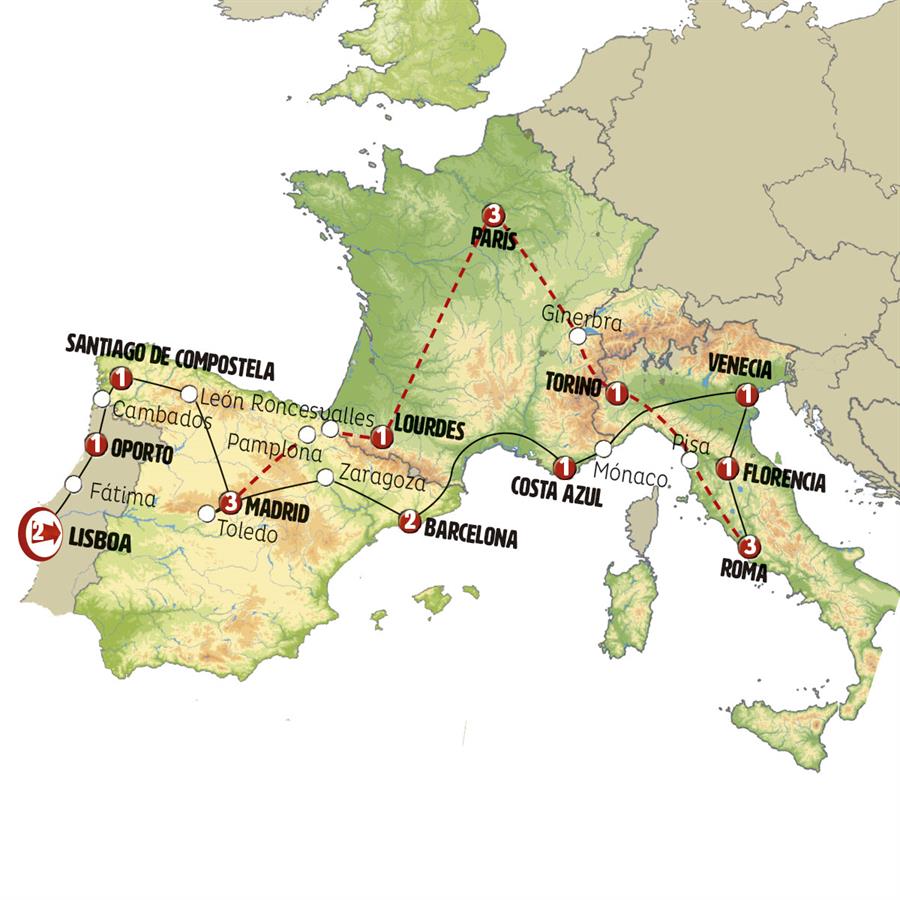 LISBOA, FATIMA, OPORTO, SANTUARIO DEL BOM JESUS, CAMBADOS, SANTIAGO DE COMPOSTELA, LUGO, O CEBREIRO, LEON, MADRID, ZARAGOZA, POBLET, BARCELONA, COSTA AZUL, MONACO, GENOVA, VENECIA, FLORENCIA, ROMA