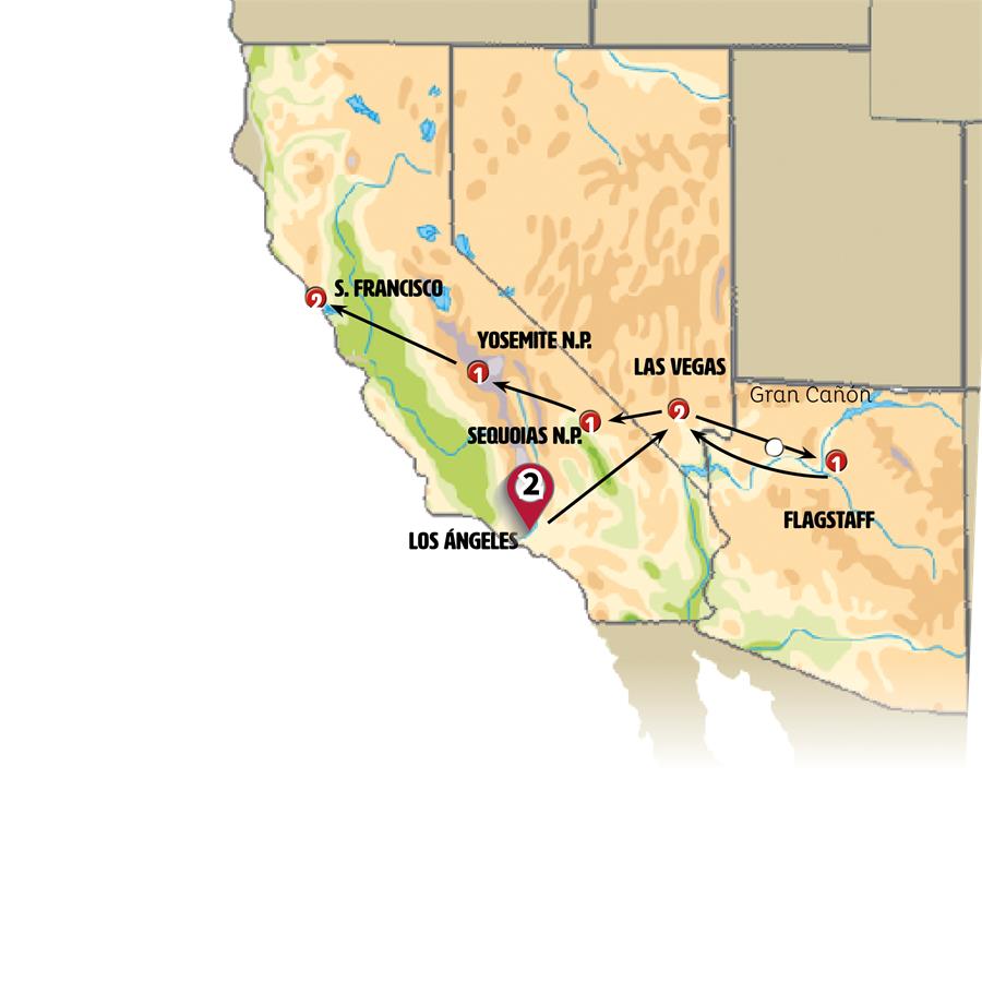 LOS ANGELES, LAS VEGAS, CAÑON DEL COLORADO, FLAGSTAFF, DEATH VALLEY, BAKERSFIELD, GRAN SEQUOYA NP, FRESNO, YOSEMITE, SAN FRANCISCO