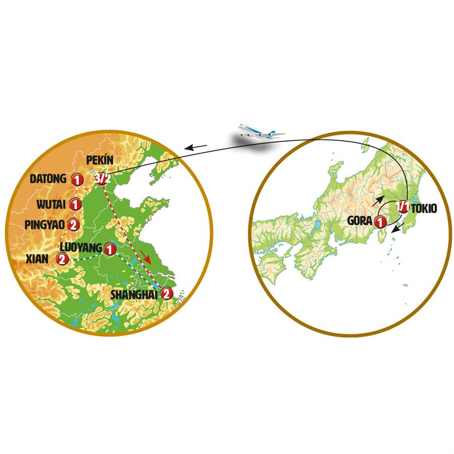 TOKIO, KAMAKURA, ENOSHIMA, ODAWARA, MONTE FUJI, KAWAGUCHIKO, PEKIN, SHANGHAI, LUOYANG, LONGMEN, SANMEXIA, XIAN, LINGFEN, MANSION CLAN WANG, PINGYAO, WUTAI, YANMENGUAN, YINGXIAN, TEMPLO COLGANTE, DATONG, JIMING POST