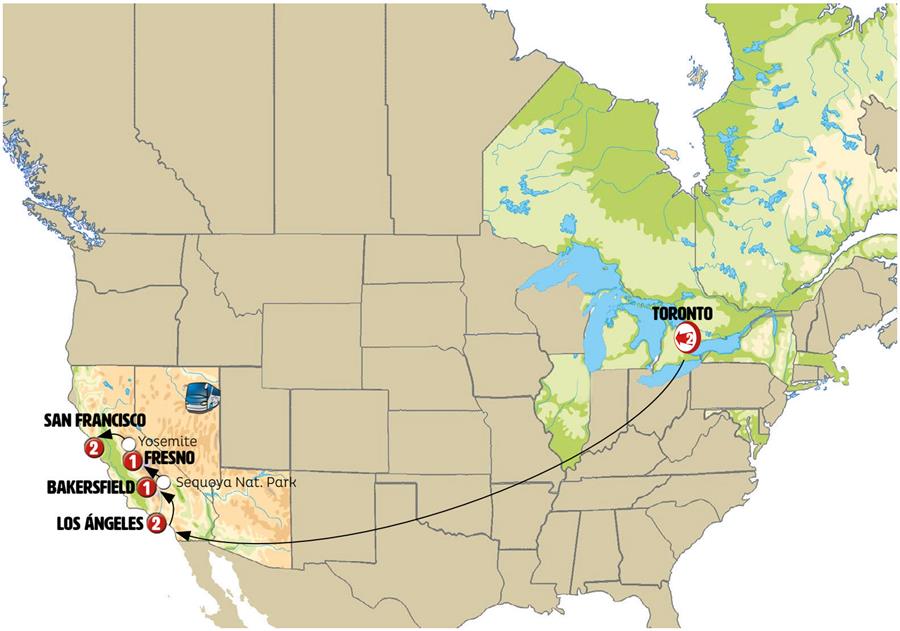 TORONTO, LOS ANGELES, SANTA MONICA, SOLVANG, BAKERSFIELD, GRAN SEQUOYA NP, FRESNO, YOSEMITE, SAN FRANCISCO