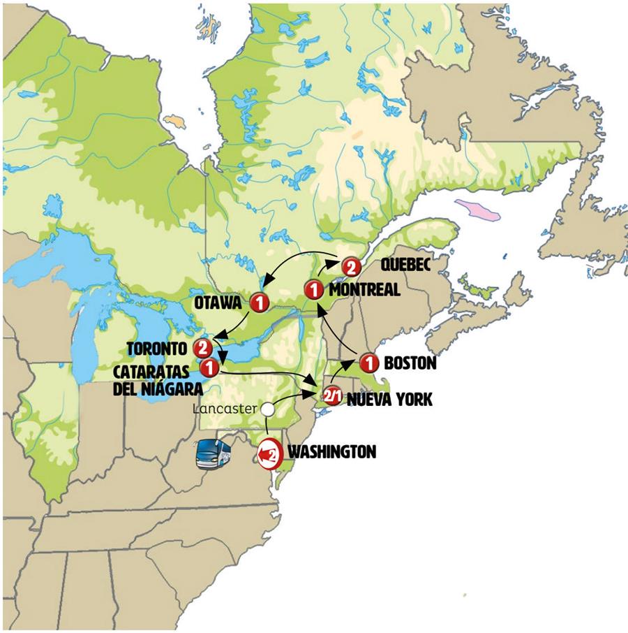 WASHINGTON, LANCASTER USA, NUEVA YORK, BOSTON, WOODSTOCK, MONTREAL, QUEBEC, ST AGATA DES MONTS, MT TREMBLANT, OTAWA, MIL ISLAS, TORONTO, NIAGARA ON THE LAKE, CATARATAS DEL NIAGARA, CORNING